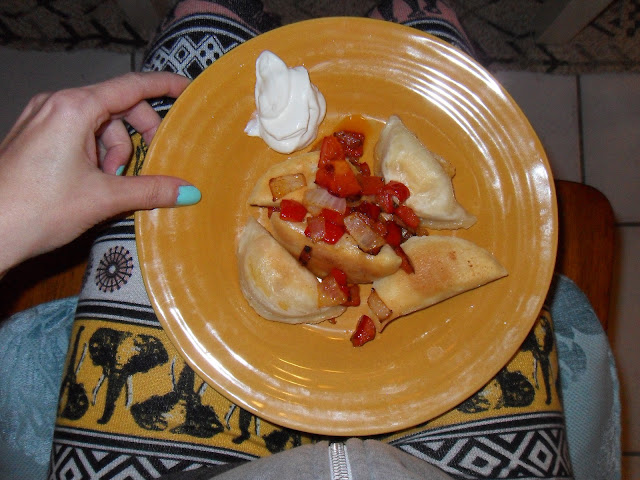 Watching Animals Unscripted while eating a vegetarian dish consisting of cheese perogies, onions, and red peppers..soo good!!